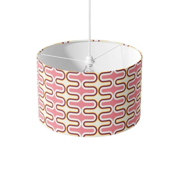 Il telaio è bianco e il paralume presenta una stampa digitale su materiale plastico di alta qualità sul lato interno e su tessuto sul lato esterno.