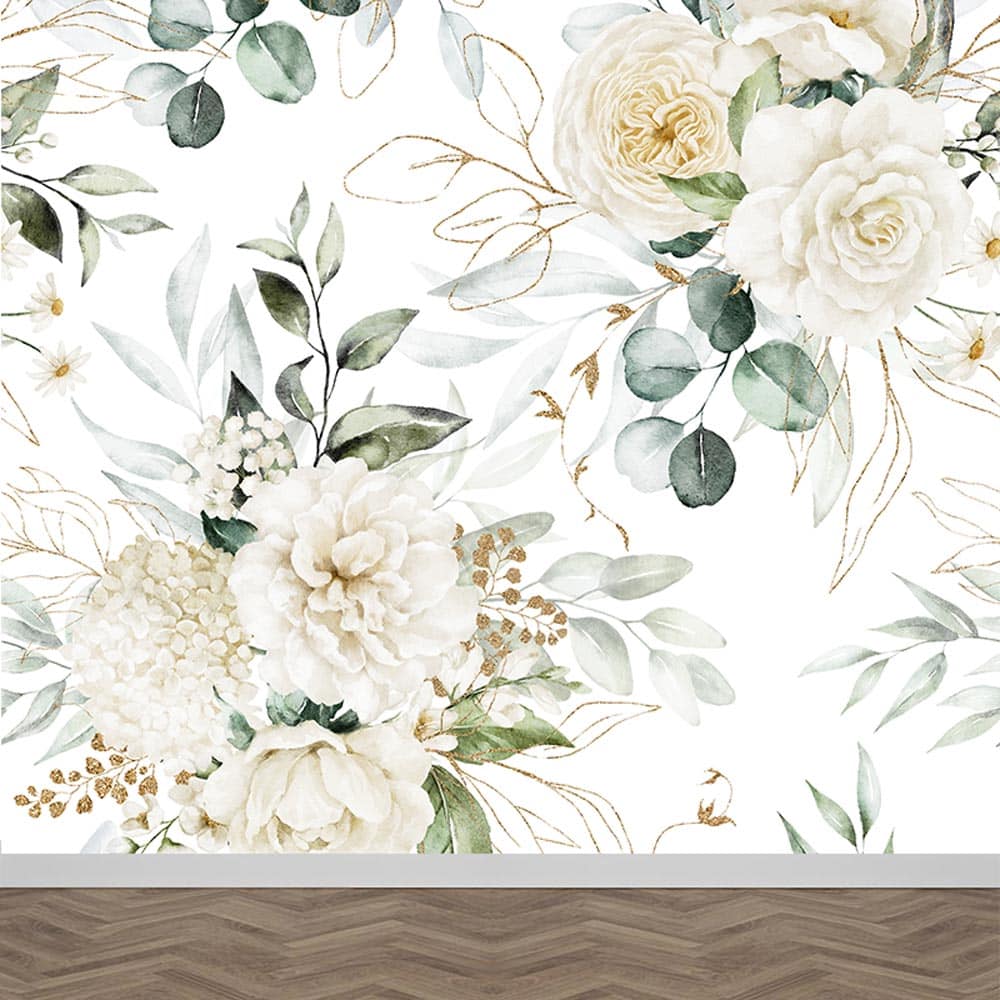Questa carta da parati è adatta per soggiorno, camera da letto, cucina, corridoio e persino per uno studio o una boutique. Il design con rose delicate e foglie di eucalipto si abbina sia a interni moderni che classici.